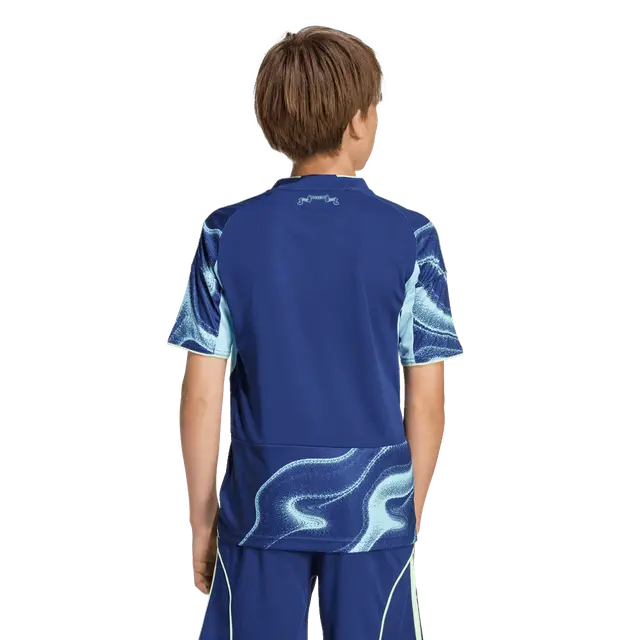 The Ajax Away Jersey 25/26 is colored navy and features a yellow/green and light blue water pattern. The classic logo is embroidered on the chest next to the logo of adidas.