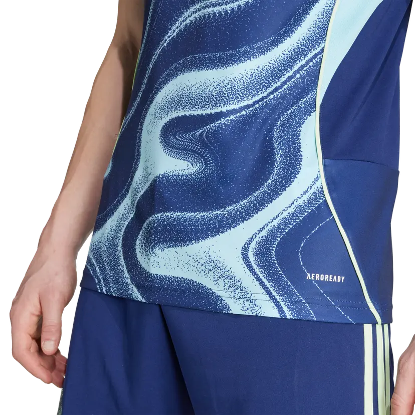 The Ajax Away Jersey 25/26 is colored navy and features a yellow/green and light blue water pattern. The classic logo is embroidered on the chest next to the logo of adidas.