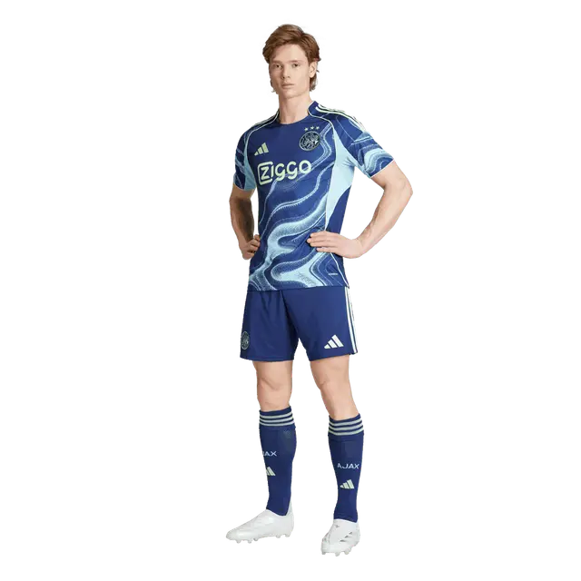 The Ajax Away Jersey 25/26 is colored navy and features a yellow/green and light blue water pattern. The classic logo is embroidered on the chest next to the logo of adidas.