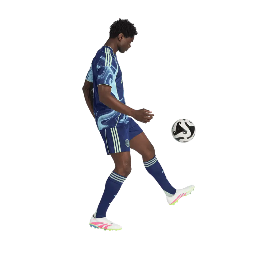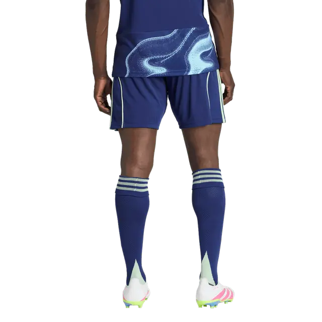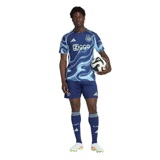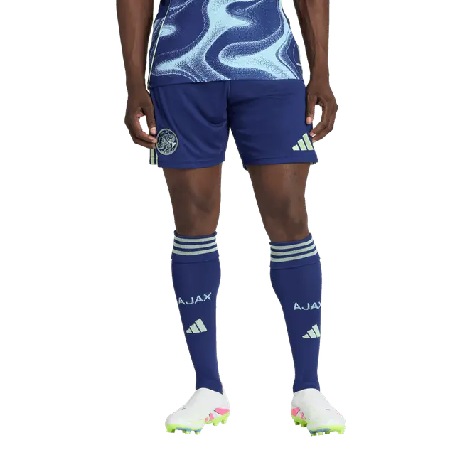 The Ajax Away Shorts 25/26 are colored navy and feature yellow/green and light blue elements. The classic logo is embroidered, just as the logo of adidas.