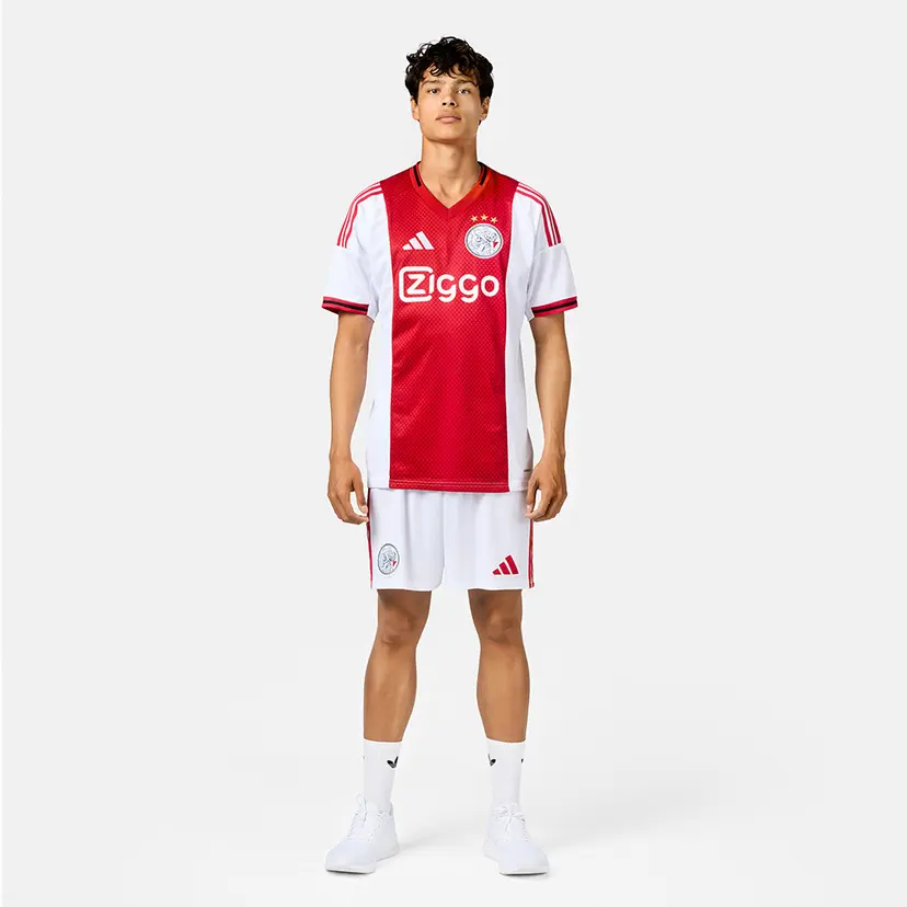 Our new home kit for the 25/26 season is available starting today. The shirt design is, as always, white-red-white and brings back the classic logo on the chest. A subtle pattern of red crosses runs through the red stripe, and on the back, a small banner pays tribute to 750 years of Amsterdam.
