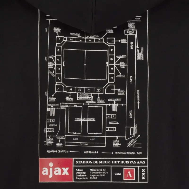 Carry a piece of history with you with this exclusive Ajax hoodie! The back features the beautiful design of the legendary De Meer stadium, home of Ajax from 1934 to 1996. A perfect choice for any fan who wants to honour the club’s rich past.