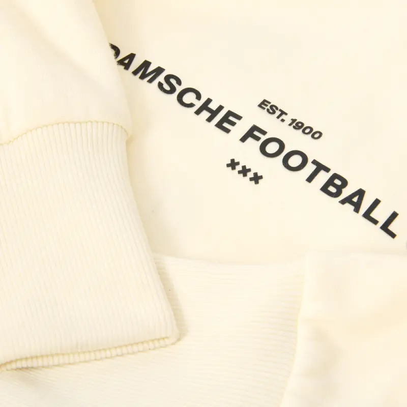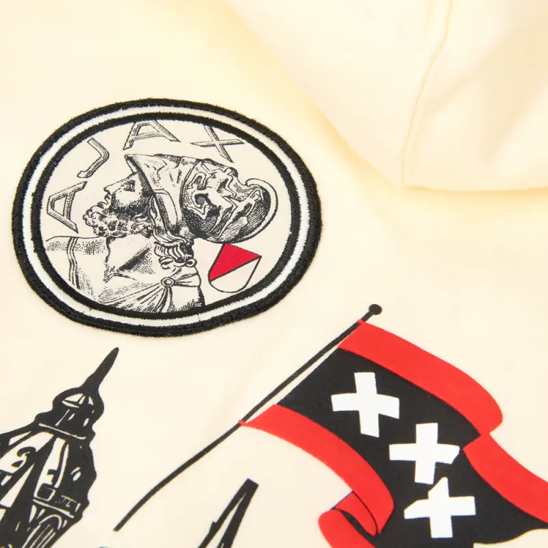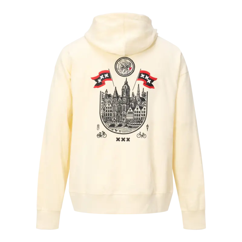 This Ajax hooded sweater in ecru offers a stylish and warm look for every supporter. The soft fabric, neutral ecru colour and Ajax and Amsterdam accents on the front and back make this hoodie perfect for everyday use. Ideal for combining comfort with your love for the club.