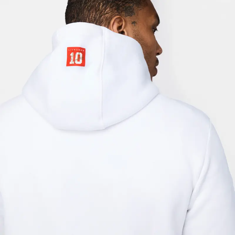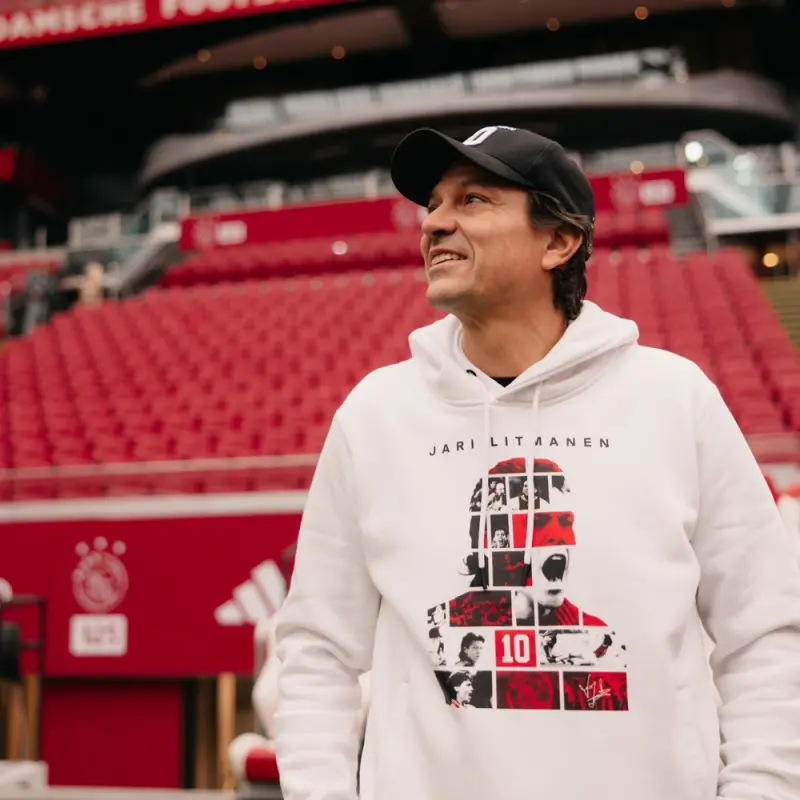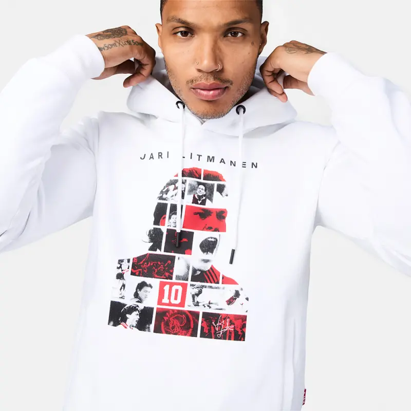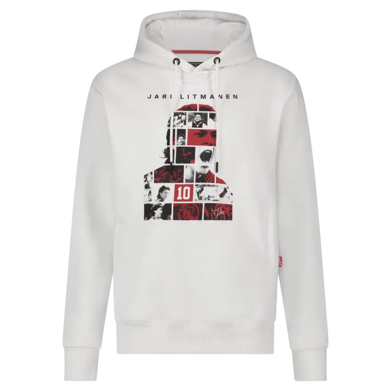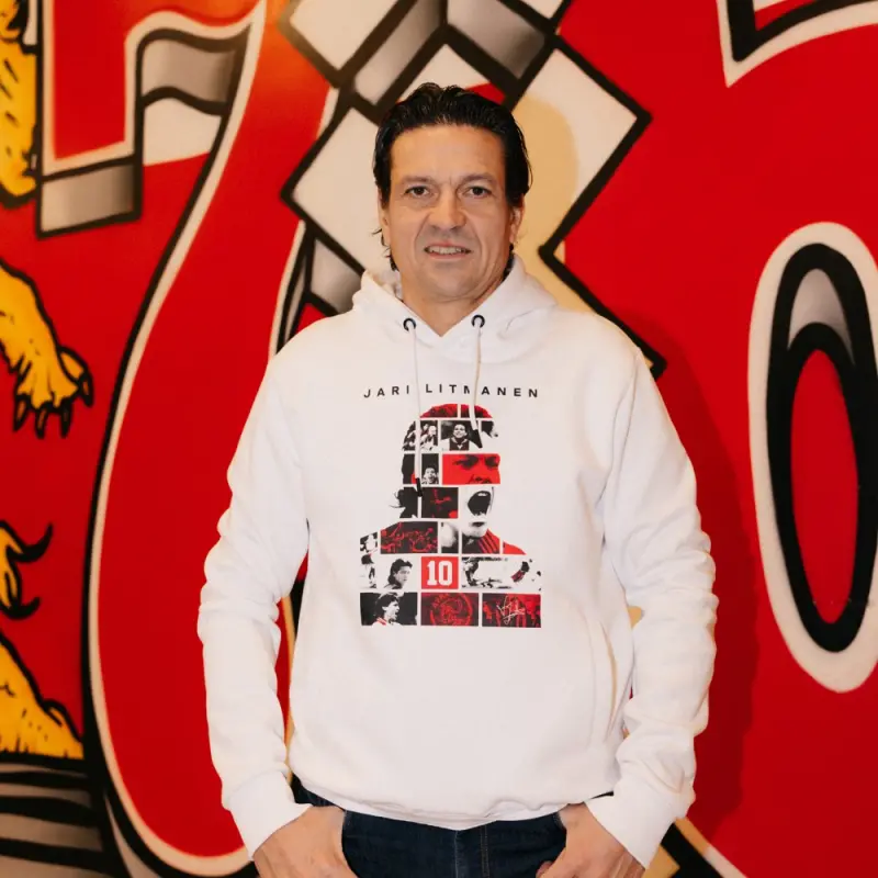 For our Finnish master. Who makes the Ajax heart beat faster with his tactical insight and velvet technique. On the chest of this hoodie is the silhouette of Jari Litmanen, filled with action photos of iconic moments of Jari Litmanen during his glorious Ajax careerère.