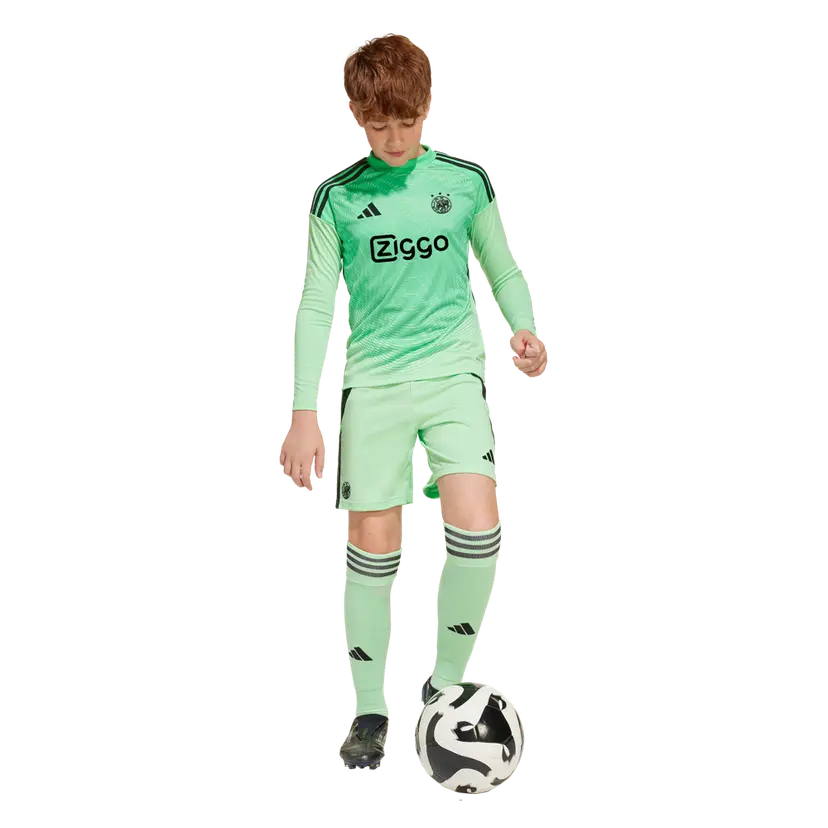 Ajax goalkeepers will wear a mint green shirt in the 25/26 season. The green fades from top to bottom into a lighter tone that continues into the shorts. The classic logo also returns here—back for good.