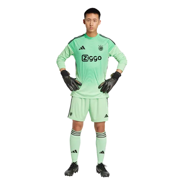 Ajax goalkeepers will wear a mint green shirt in the 25/26 season. The green fades from top to bottom into a lighter tone that continues into the shorts. The classic logo also returns here—back for good.