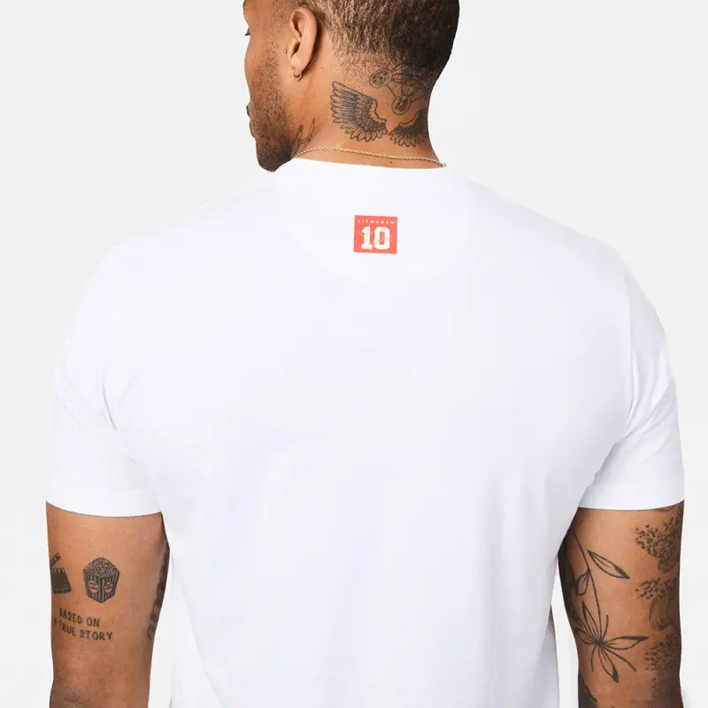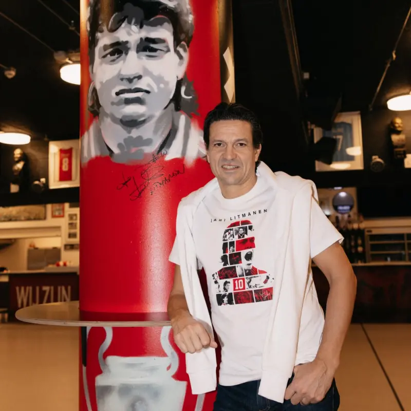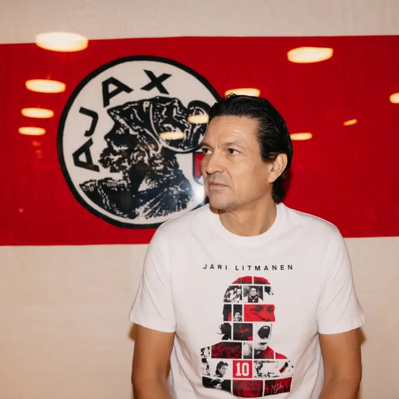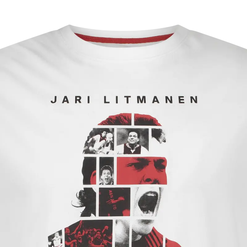 For our Finnish master. Who makes the Ajax heart beat faster with his tactical insight and velvet technique. The chest of this T-shirt features the silhouette of Jari Litmanen, filled with action photos of iconic moments of Jari Litmanen during his glittering Ajax careerère.