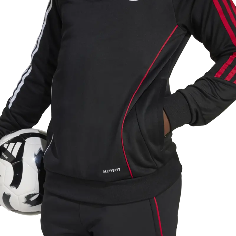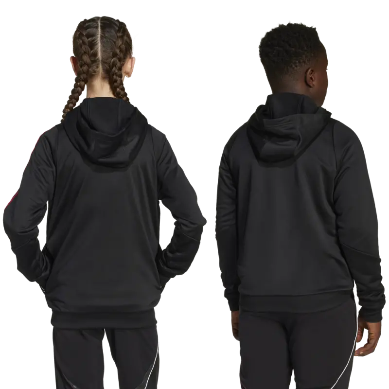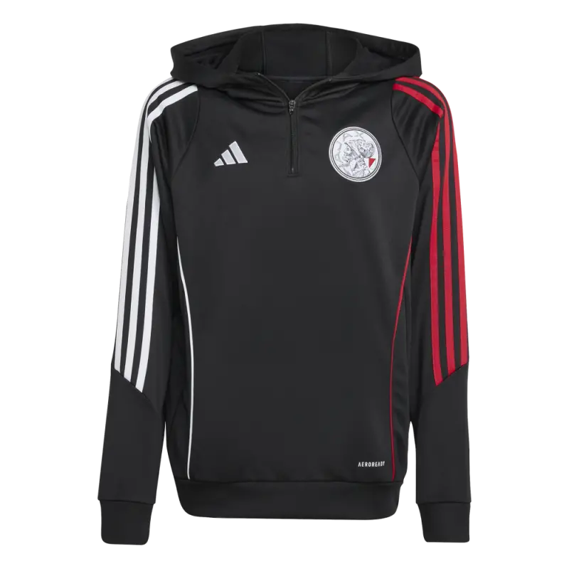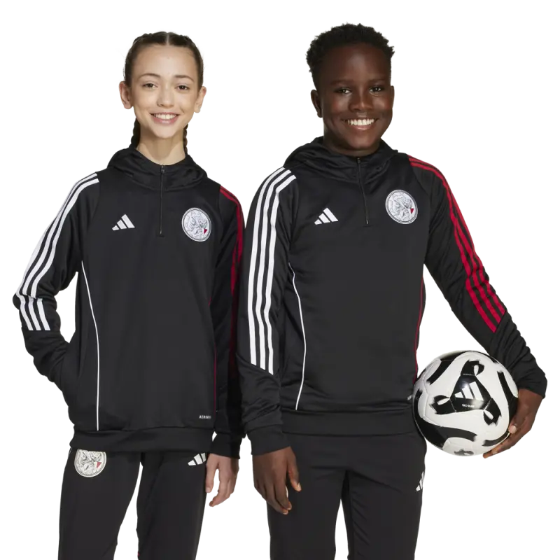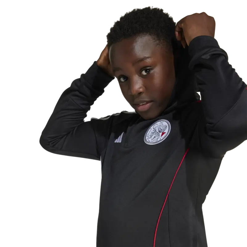 The Ajax Training Hoodie 25/26 has a half-zip, hood with drawstring, and long sleeves. The adidas stripes on the shoulders are red on one side and white on the other. For optimal freedom of movement, the hoodie is equipped with a fine stretch.