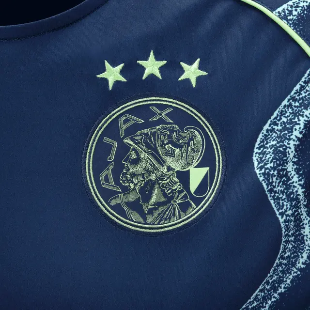The Ajax Away Jersey 25/26 is colored navy and features a yellow/green and light blue water pattern. The classic logo is embroidered on the chest next to the logo of adidas.